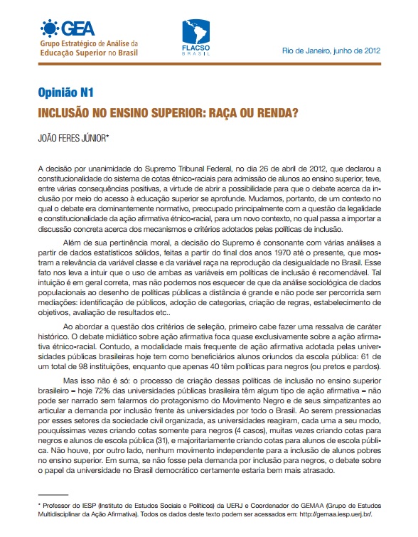 • Opinião N1 – INCLUSÃO NO ENSINO SUPERIOR: RAÇA OU RENDA?