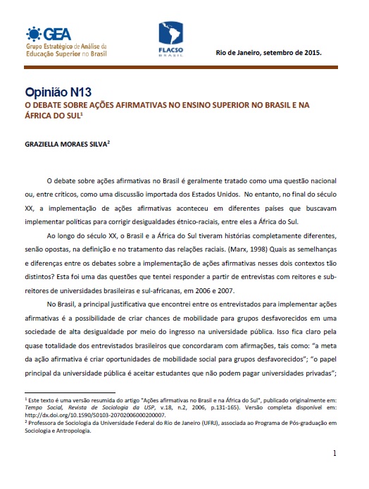 • Opinião N13 – O DEBATE SOBRE AÇÕES AFIRMATIVAS NO ENSINO SUPERIOR NO BRASIL E NA ÁFRICA DO SUL
