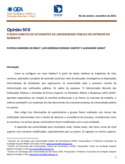 Opinião N18 – O NOVO HABITUS DE ESTUDANTES DA UNIVERSIDADE PÚBLICA NO INTERIOR DO NORDESTE Back 10 abril, 2026 by hacklab   Document Opiniao_18 Baixar Metadados Thumbnail Share TítuloOpinião N18 – O NOVO HABITUS DE ESTUDANTES DA UNIVERSIDADE PÚBLICA NO INTERIOR DO NORDESTEAutorPatricia Bandeira de Melo, Luís Henrique Romani Campos e Alexandre ZariasAno2015.0Link OriginalBibliotecaTipos de publicaçãoArtigosPaísesAmerica Latina > BrasilIdiomaPortuguês Continue browsing Juventudes, violências e o Estado: Jovens em territórios com o programa Unidades de Polícia Pacificadora no Rio de Janeiro Opinião N19 – O PROUNI E A DEMOCRATIZAÇÃO DO ACESSO À EDUCAÇÃO SUPERIOR NO BRASIL: OS DIFERENTES SENTIDOS DE UMA POLÍTICA PÚBLICA Voltar para a lista