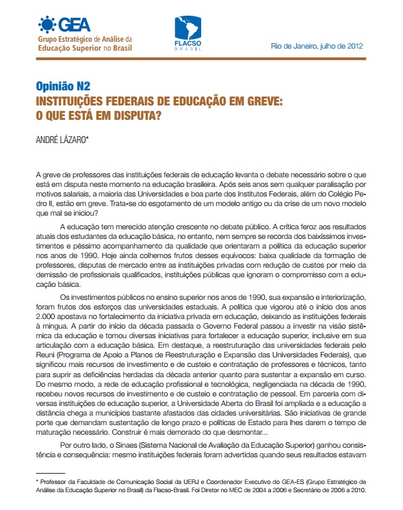Opinião N2 – INSTITUIÇÕES FEDERAIS DE EDUCAÇÃO EM GREVE: O QUE ESTÁ EM DISPUTA? Back 10 abril, 2026 by hacklab   Document op02 Baixar Metadados Thumbnail Share TítuloOpinião N2 - INSTITUIÇÕES FEDERAIS DE EDUCAÇÃO EM GREVE: O QUE ESTÁ EM DISPUTA?DescriçãoArtigo produzido pelo Coordenador Executivo do GEA.AutorAndré LázaroAno2012.0Link OriginalBibliotecaTipos de publicaçãoArtigosPaísesAmerica Latina > BrasilIdiomaPortuguês Continue browsing Opinião N1 – INCLUSÃO NO ENSINO SUPERIOR: RAÇA OU RENDA? Opinião N3 – O PNE E A EDUCAÇÃO SUPERIOR: DESAFIOS À CONSTRUÇÃO DE UMA POLÍTICA DE ESTADO Voltar para a lista