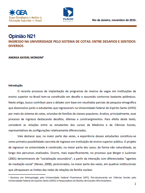 Opinião N21 – INGRESSO NA UNIVERSIDADE PELO SISTEMA DE COTAS: ENTRE DESAFIOS E SENTIDOS DIVERSOS Back 10 abril, 2026 by hacklab   Document Opiniao_21 Baixar Metadados Thumbnail Share TítuloOpinião N21 – INGRESSO NA UNIVERSIDADE PELO SISTEMA DE COTAS: ENTRE DESAFIOS E SENTIDOS DIVERSOSAutorAndrea Bayerl MongimAno2015.0Link OriginalBibliotecaTipos de publicaçãoArtigosPaísesAmerica Latina > BrasilIdiomaPortuguês Continue browsing Opinião N20 – A PARCERIA ENTRE UNIVERSIDADE E MOVIMENTOS SOCIAIS NA AMPLIAÇÃO DO ACESSO E PERMANÊNCIA AO ENSINO SUPERIOR PÚBLICO Opinião N22 – COR E CURSO NA INTERIORIZAÇÃO DE UMA UNIVERSIDADE FEDERAL Voltar para a lista